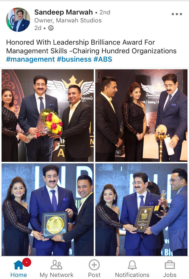Chief Scout for India Dr. Sandeep Marwah, who is also the honorable Chancellor of the AAFT University was honored for his international leadership qualities in a grand function at Hotel Radisson by Dream Catcher Organization. He received the much coveted India Leadership Award 2019.